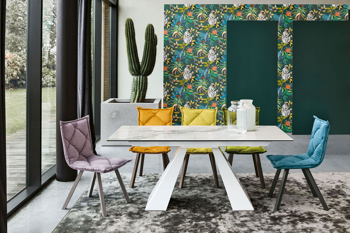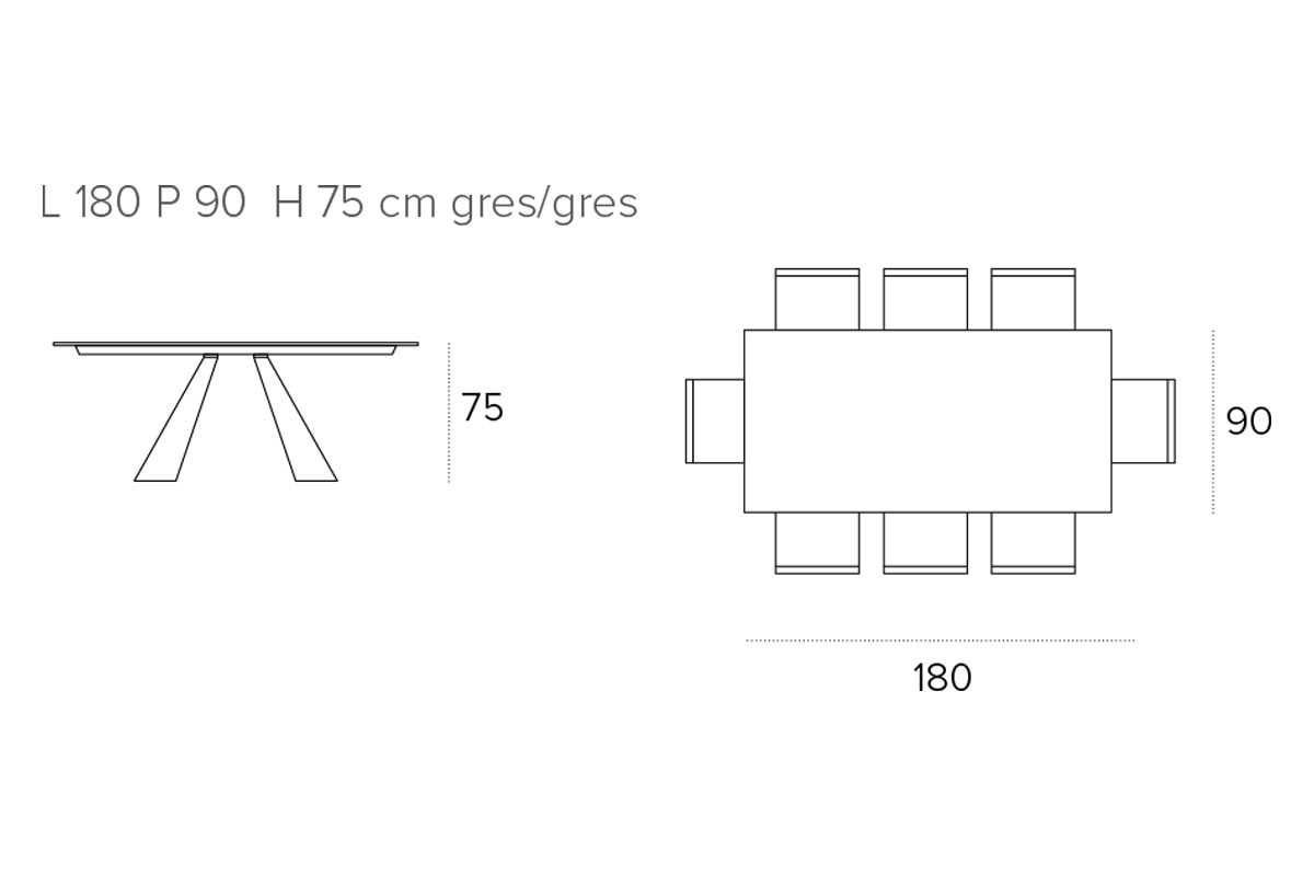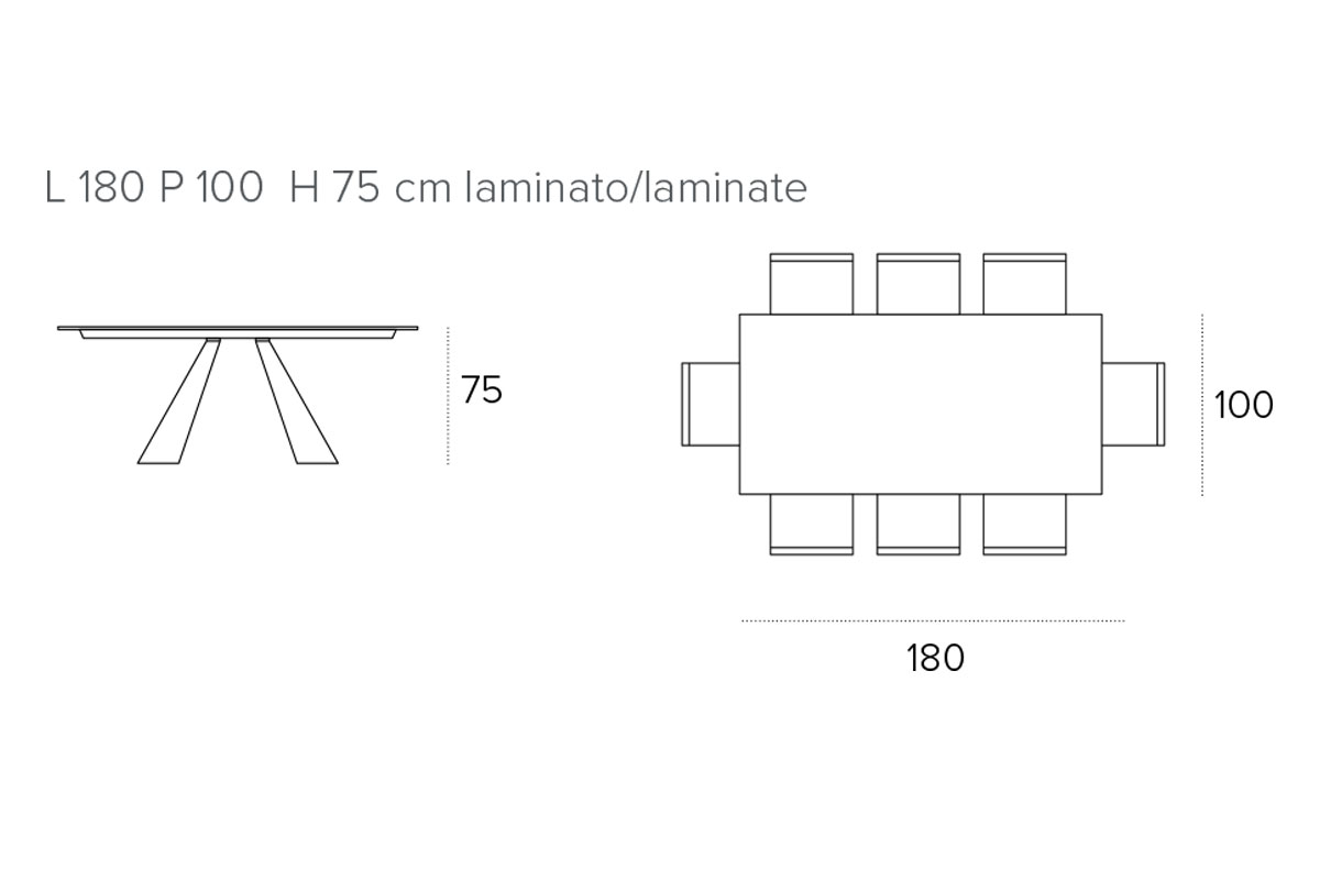 Il tavolo fisso da 180 cm è disponibile nella sola variante rettangolare. La struttura è in metallo verniciato mentre il piano è in laminato o in gres porcellanato.