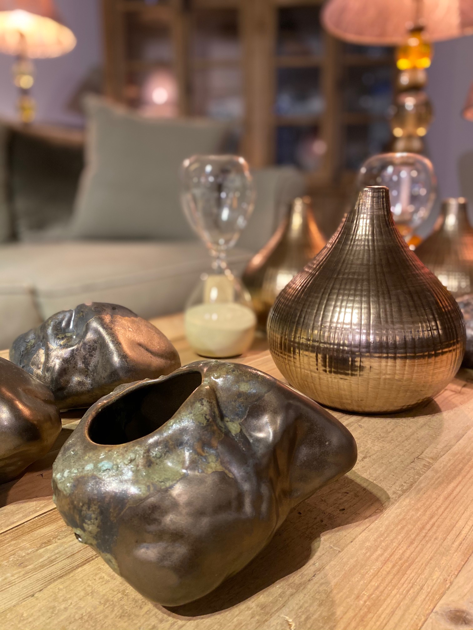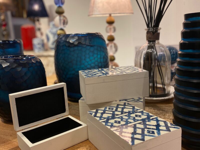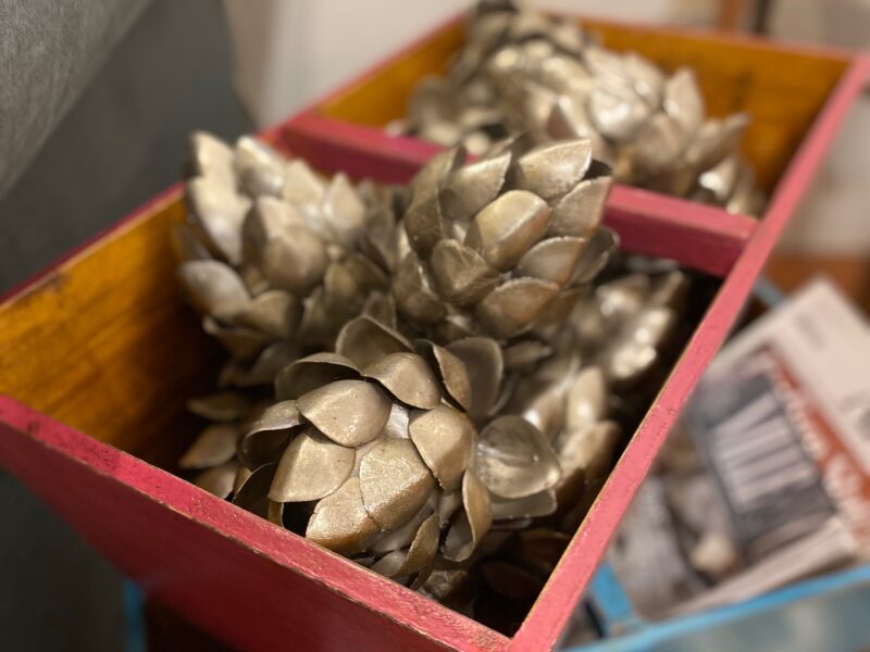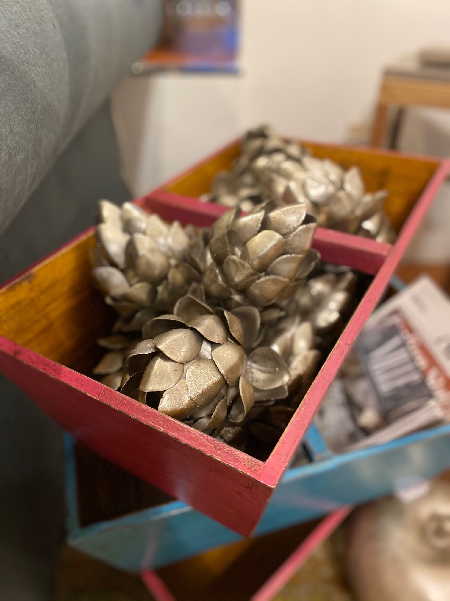 Le bellissime sfere decorate a mano da esporre in vassoi coordinati o da mettere nelle librerie, scatole porta gioielli di varie dimensioni, le pigne natalizie color bronzo e le mele decorative per chi ama gli oggetti più originali.