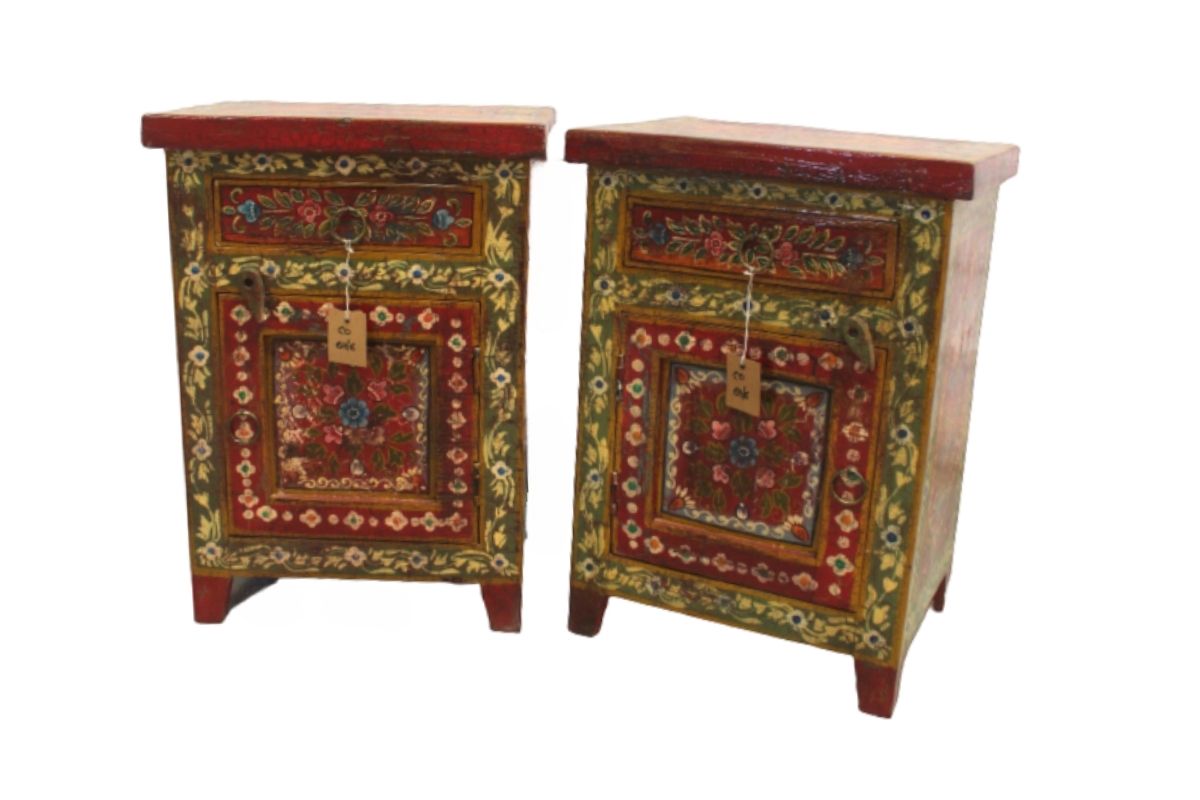Comodino indiano con cassetto e anta. Dipinto e lavorato a mano, finitura lucida.