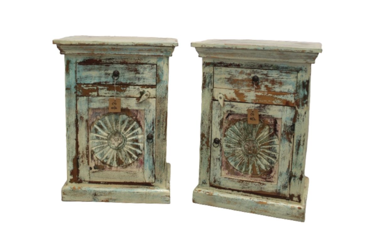 Comodino indiano con cassetto e anta. Dipinto e lavorato a mano, finitura lucida.