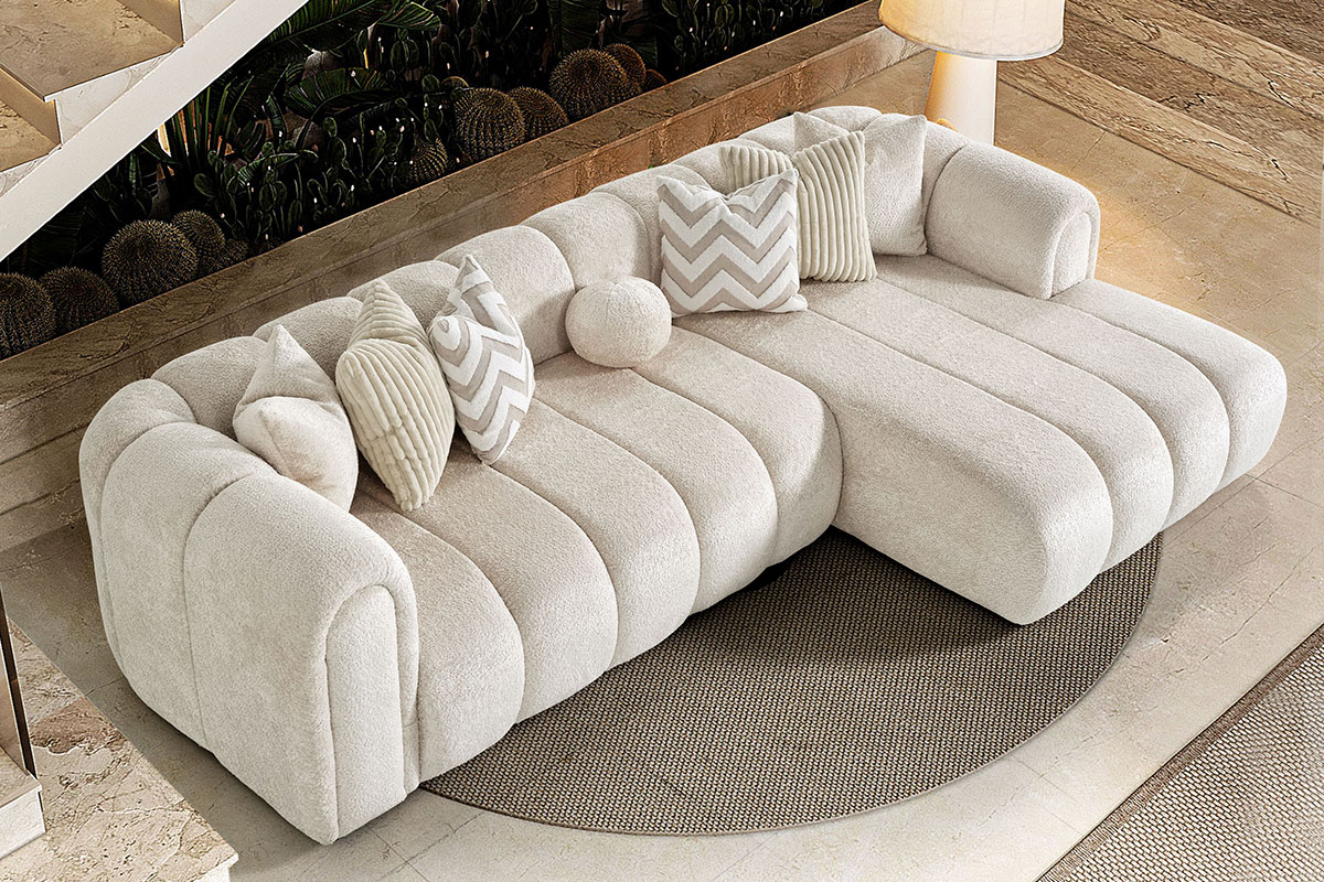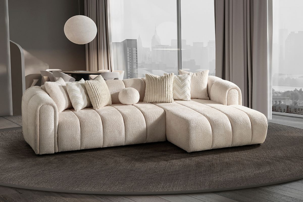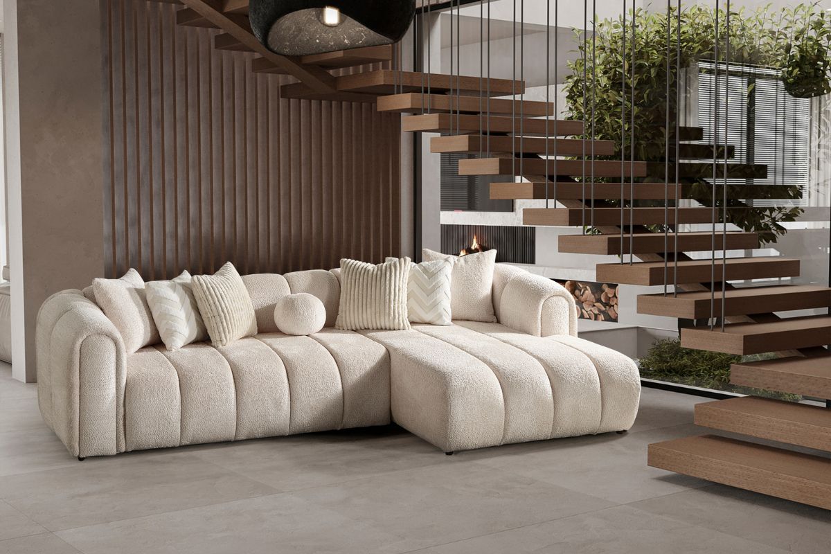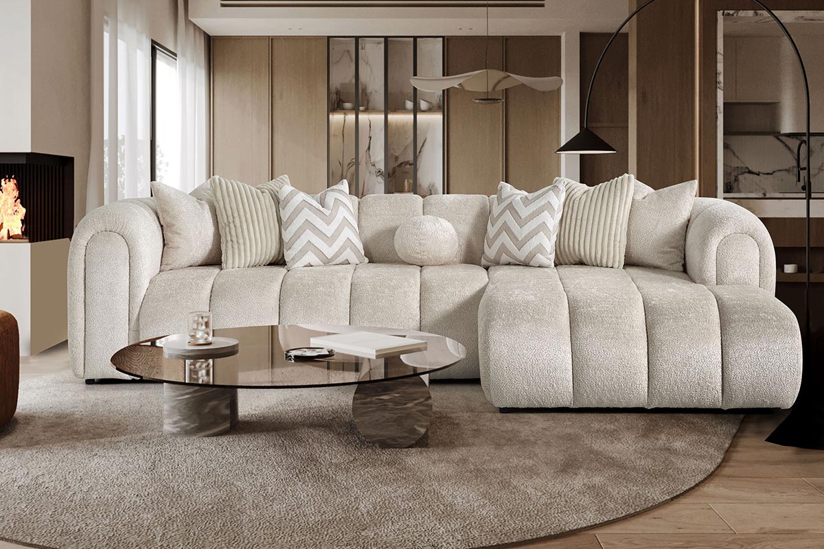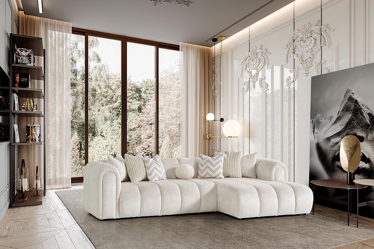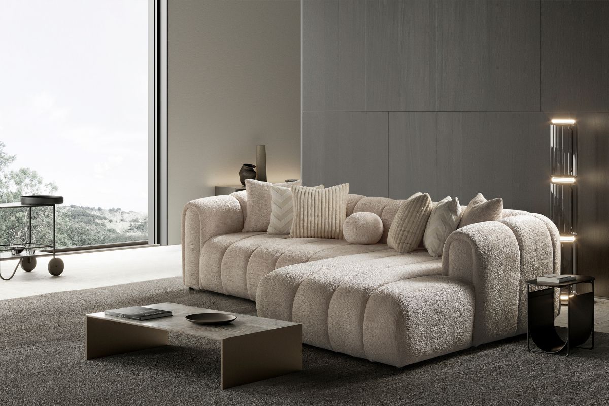 Denver angolare in super promozione. Solo su questo modello della collezione Dalì potrete usufruire di uno sconto del 50+20% sul prezzo di listino. Il design moderno, marcato dalle linee verticali, mettono in risalto il prezioso tessuto bouclè.