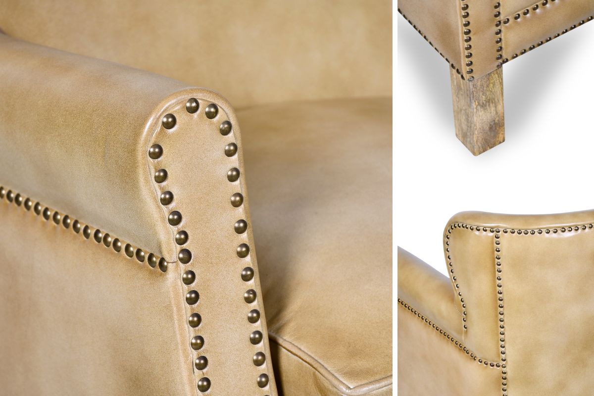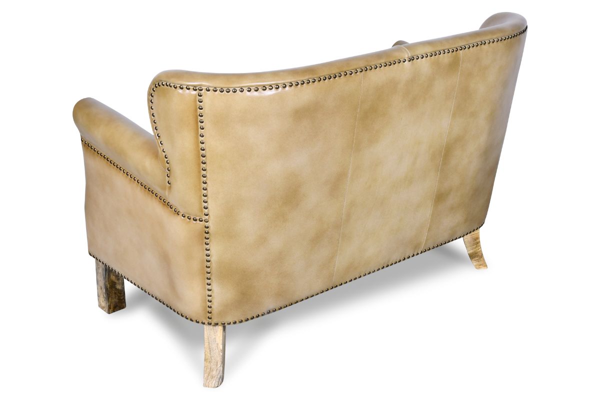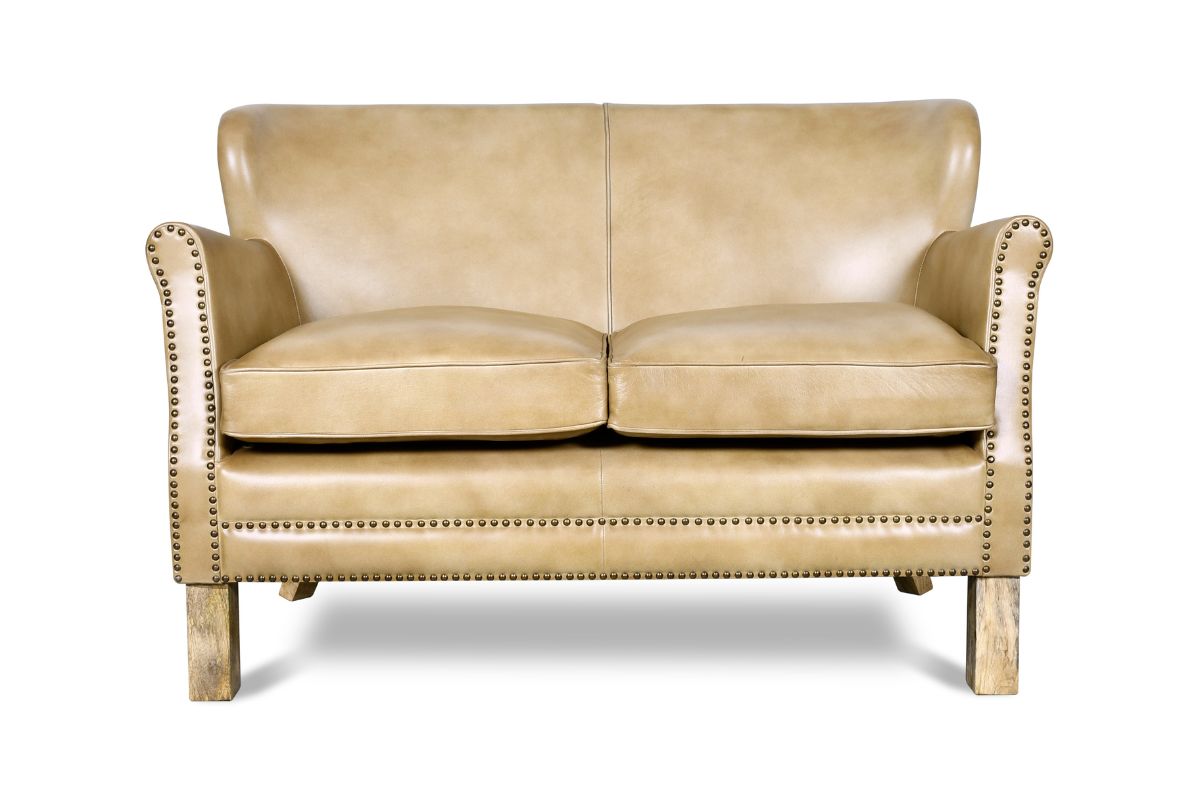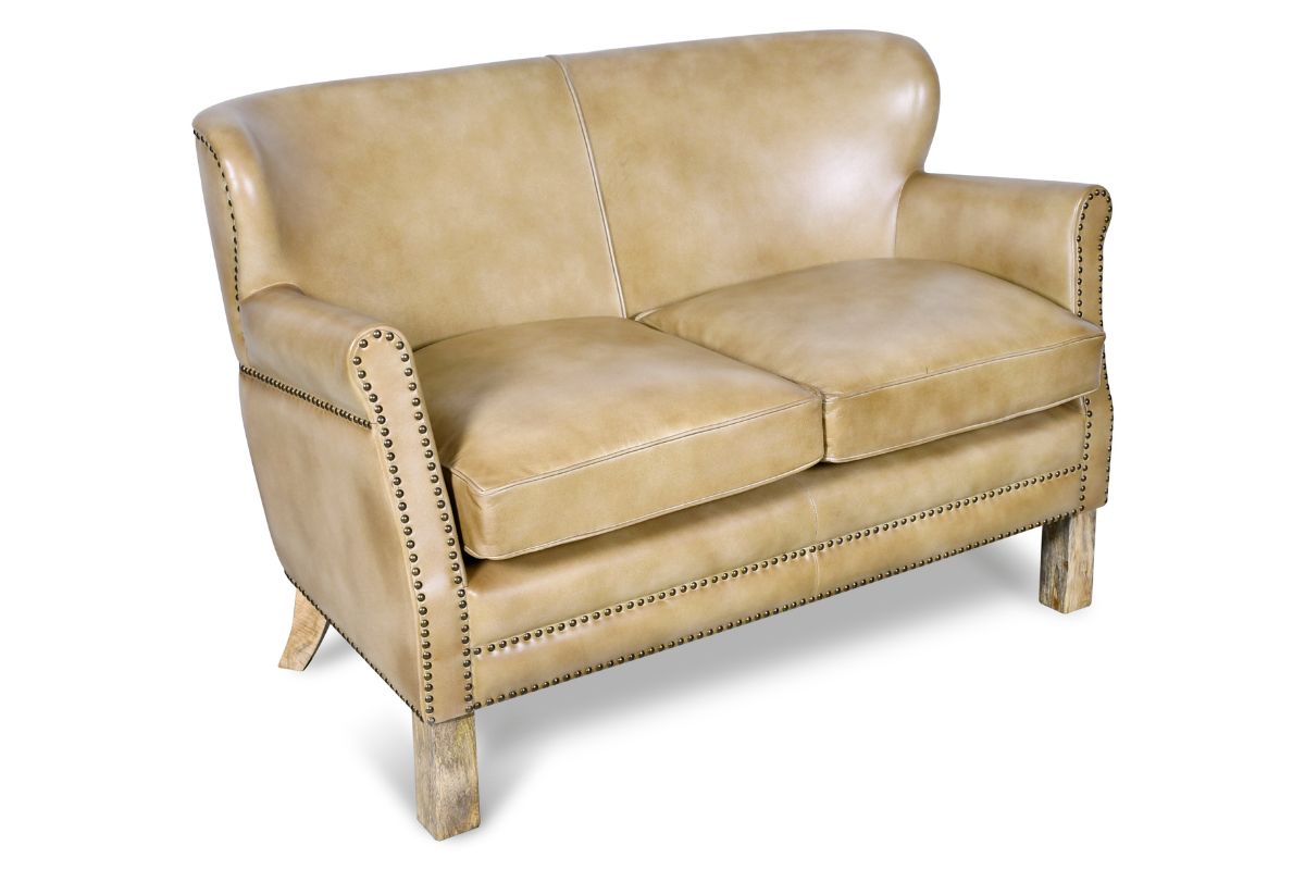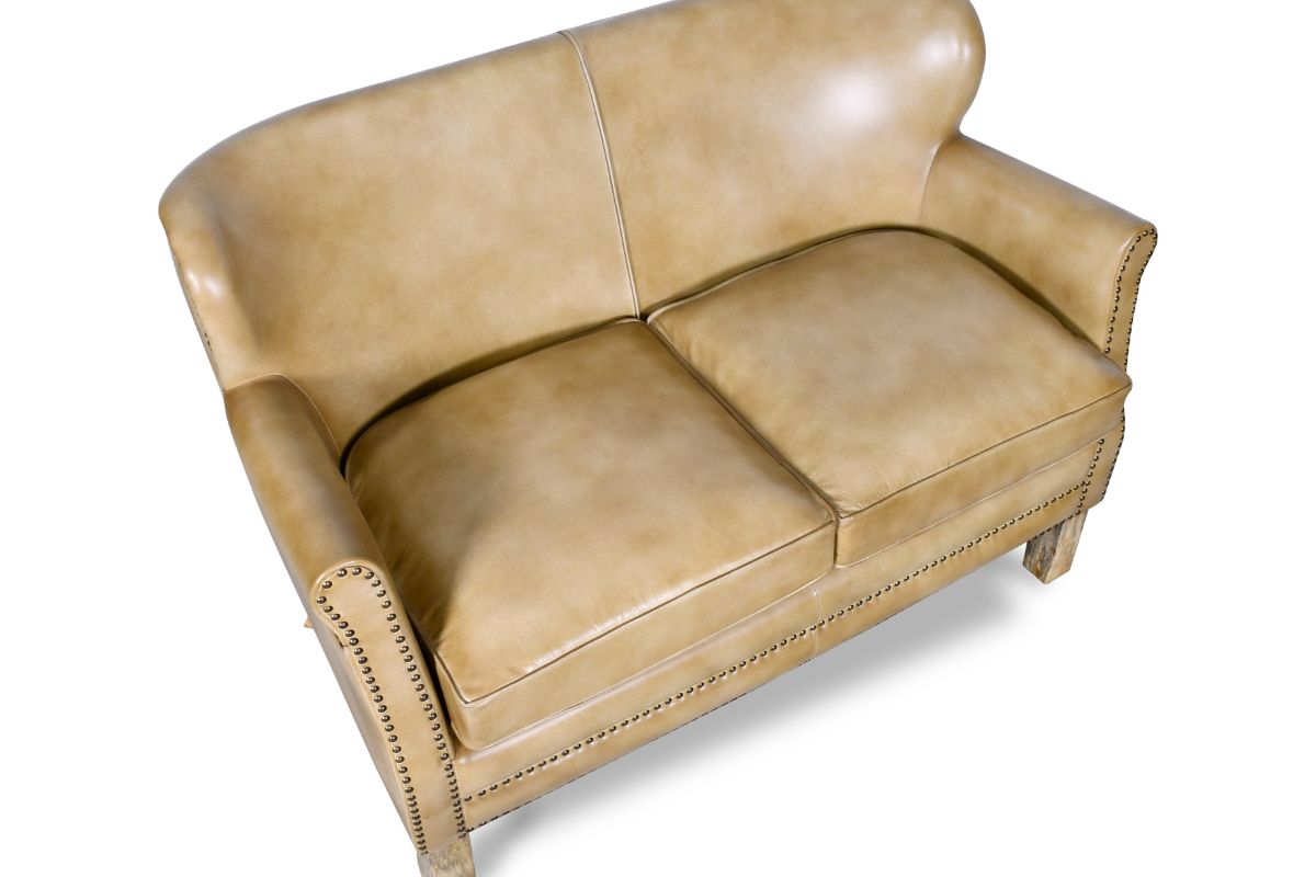Divanetto in pelle crema. La lavorazione della pelle è completata dal design con borchie metalliche perimetrali. Struttura e gambe in legno.