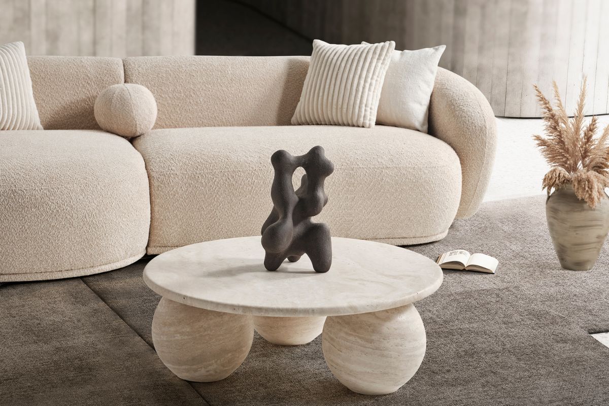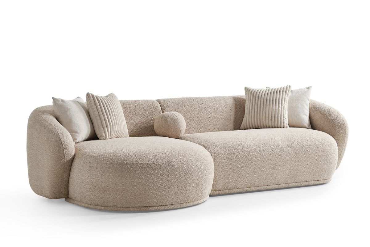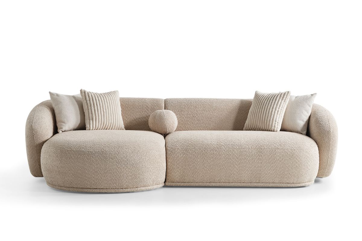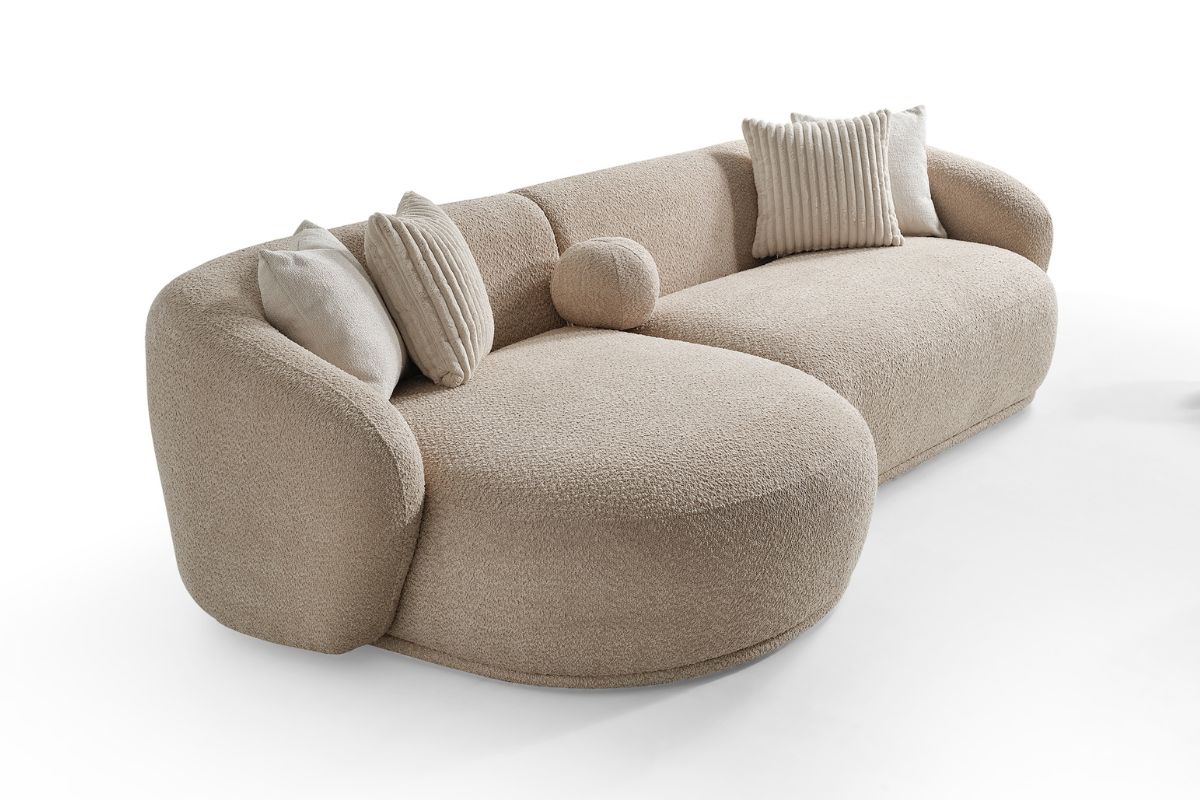 Helsinki con chaise longue integrata arricchisce la Collezione Dalì. Questo divano si distingue per le linee morbide che ricordano una pietra levigata. Le linee morbide e avvolgenti si sposano con il tessuto bouclè.