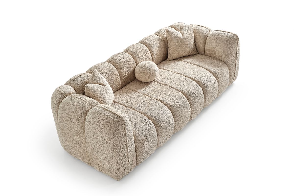 Mosca divano di design 3 posti si aggiunge alla Collezione Dalì. Questo divano si distingue per le linee morbide ed il bracciolo che sfoggia una cucitura centrale. Le linee morbide e avvolgenti si sposano con il morbido tessuto bouclè.