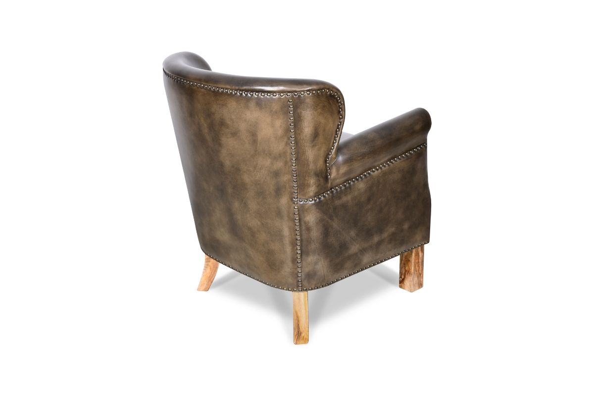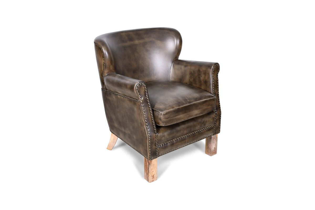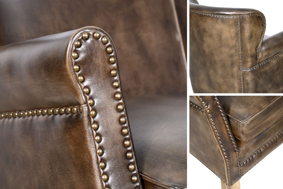 Poltroncina in pelle testa di moro. La lavorazione a della pelle Completano il design le borchie metalliche perimetrali. Struttura e gambe in legno.
