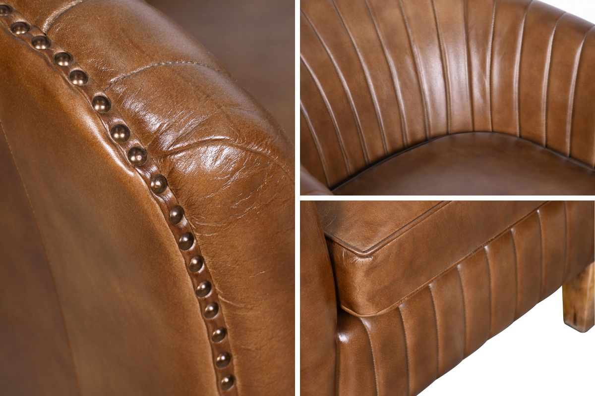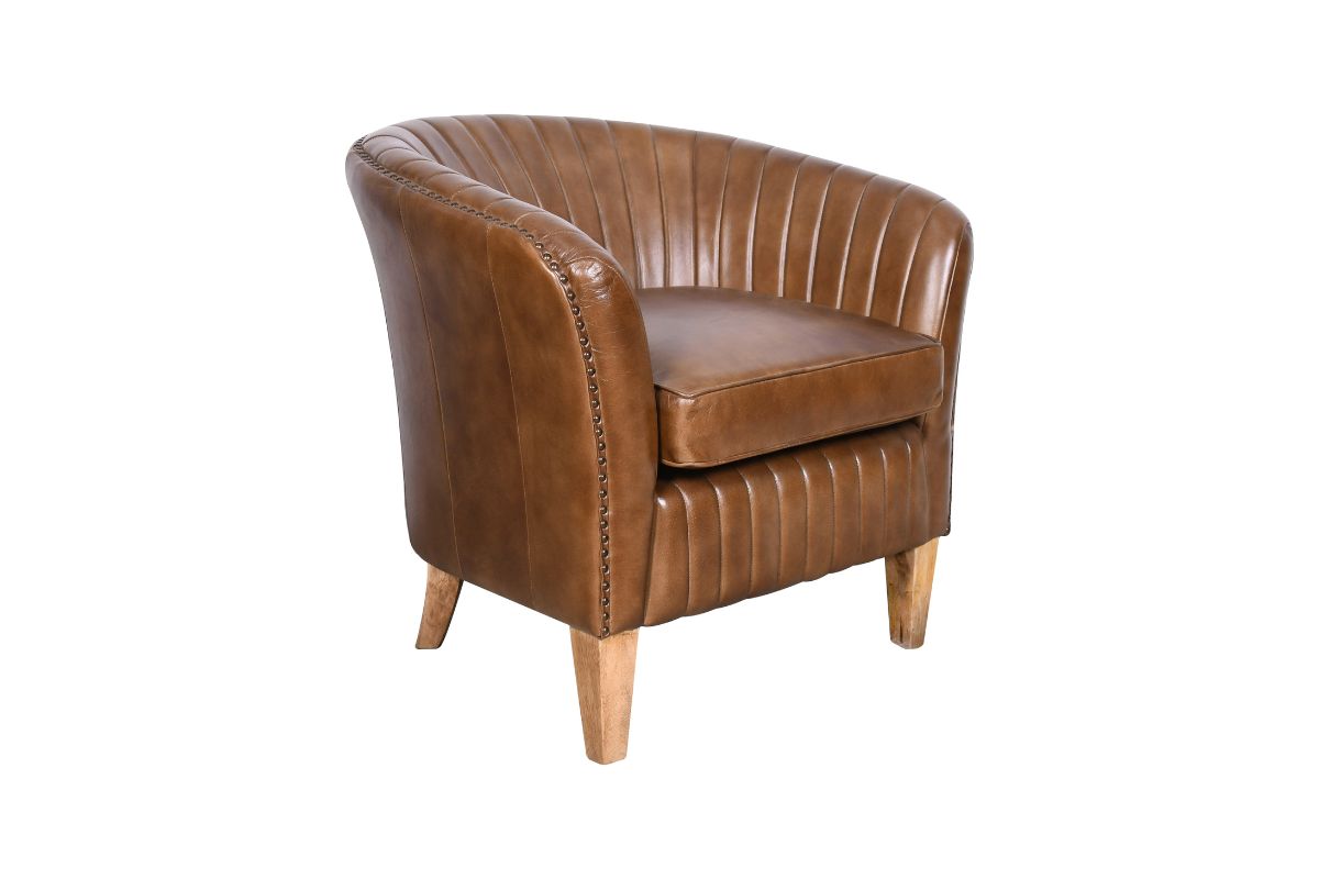 Poltroncina in pelle tabacco con schienale basso. La lavorazione a della pelle a coste è abbinata ad un cuscino di seduta liscio. Completano il design le borchie metalliche perimetrali. Struttura e gambe in legno.