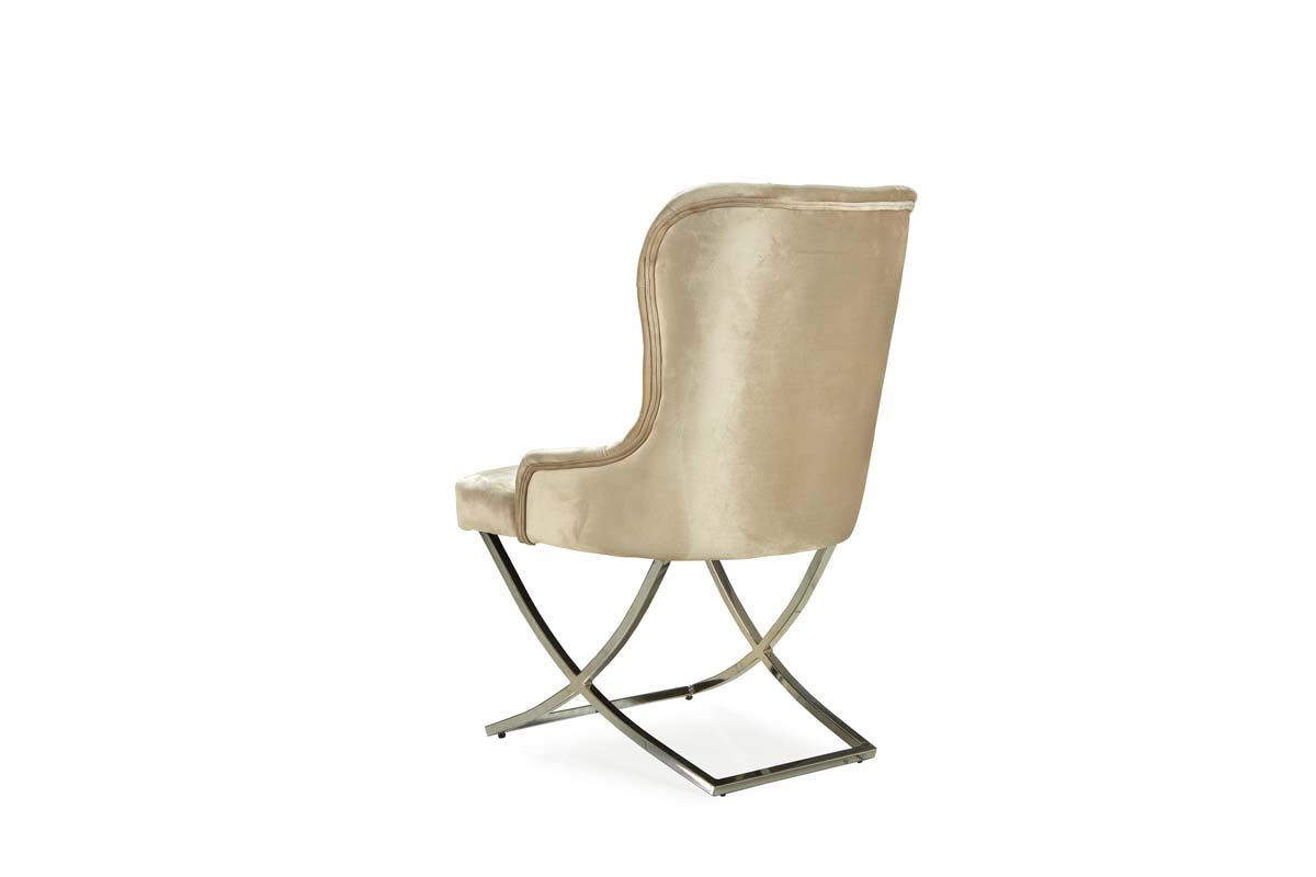 Design confortevole ed ergonomico per questa sedia dalla preziosa imbottitura capitonné e il design ergonomico ed avvolgente arricchito dalla struttura delle gambe in metallo oro.