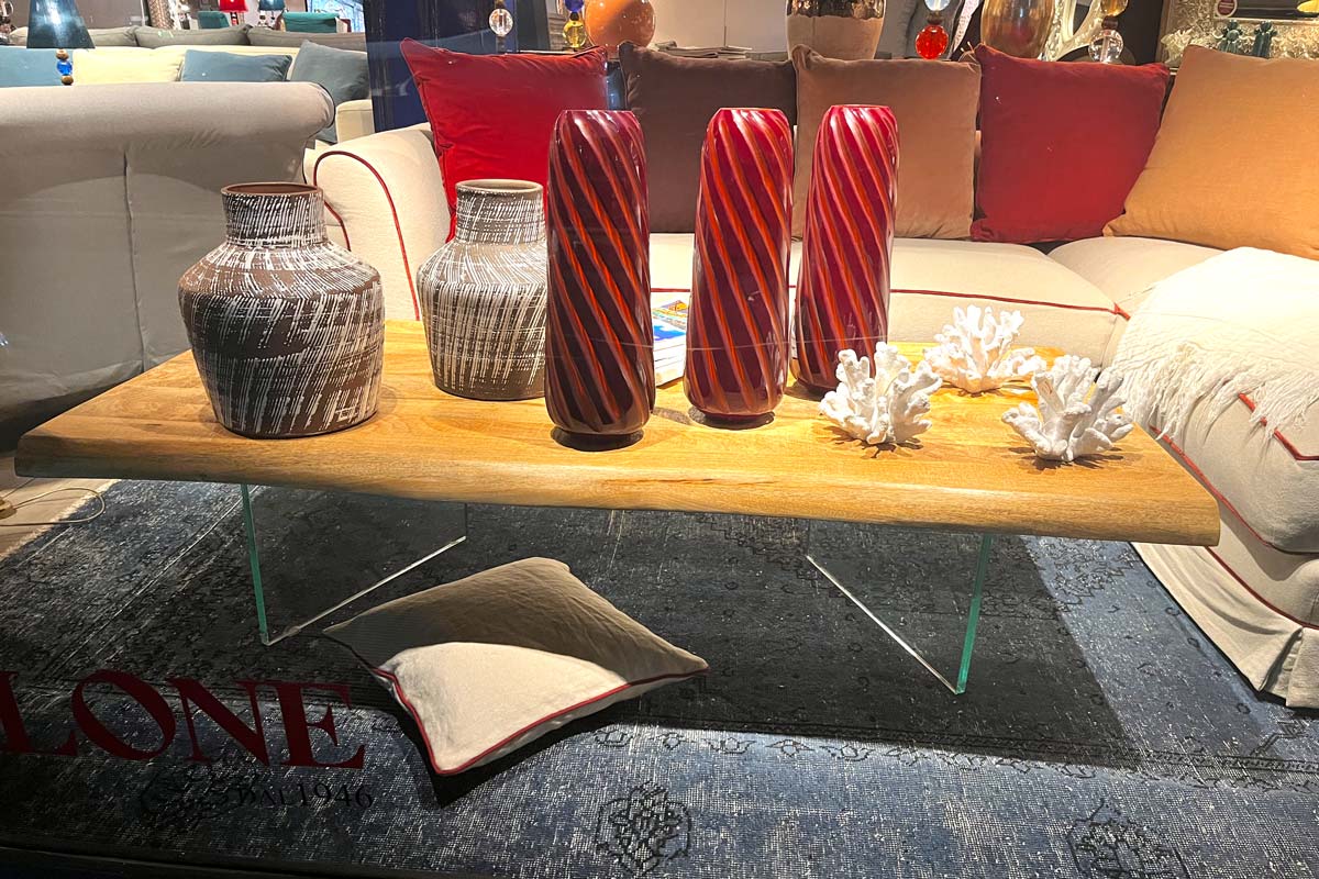 Tavolino da salotto con piano in legno e gambe in vetro.