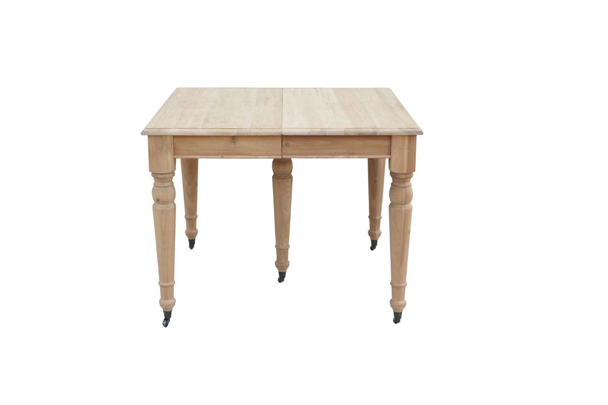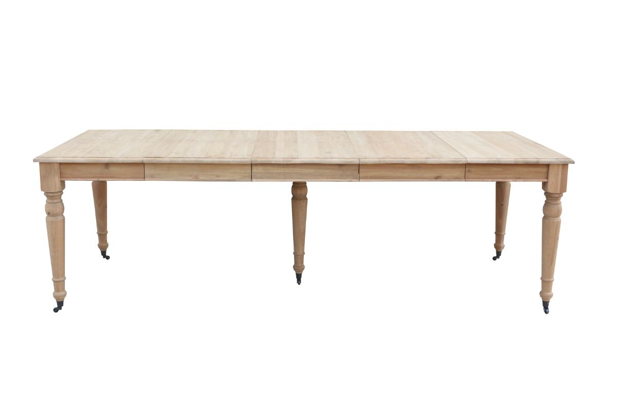 Tavolo da pranzo provenzale estensibile, grazie alle tavole supplementari. Il piano è realizzato in legno di pino naturale con i piedini dotati di rotelle.