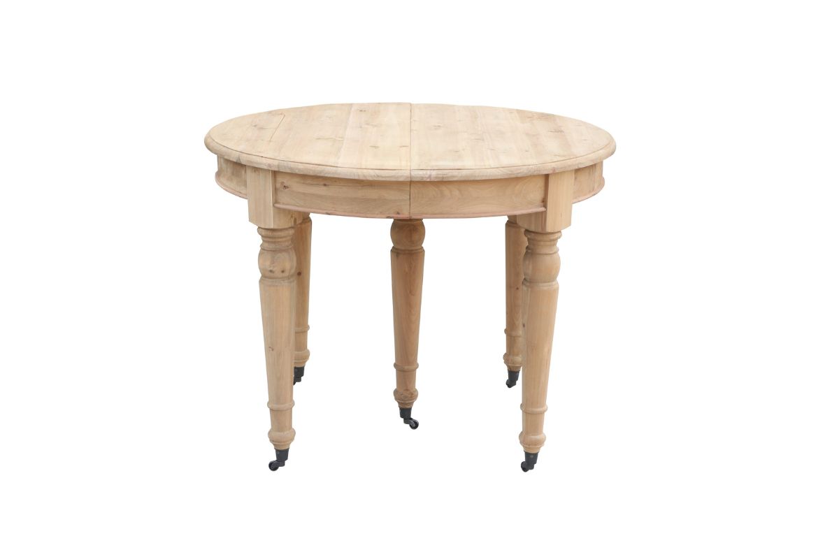 Tavolo da pranzo provenzale rotondo ed estensibile, grazie alle tavole supplementari. Il piano è realizzato in legno di pino naturale con i piedini dotati di rotelle.
