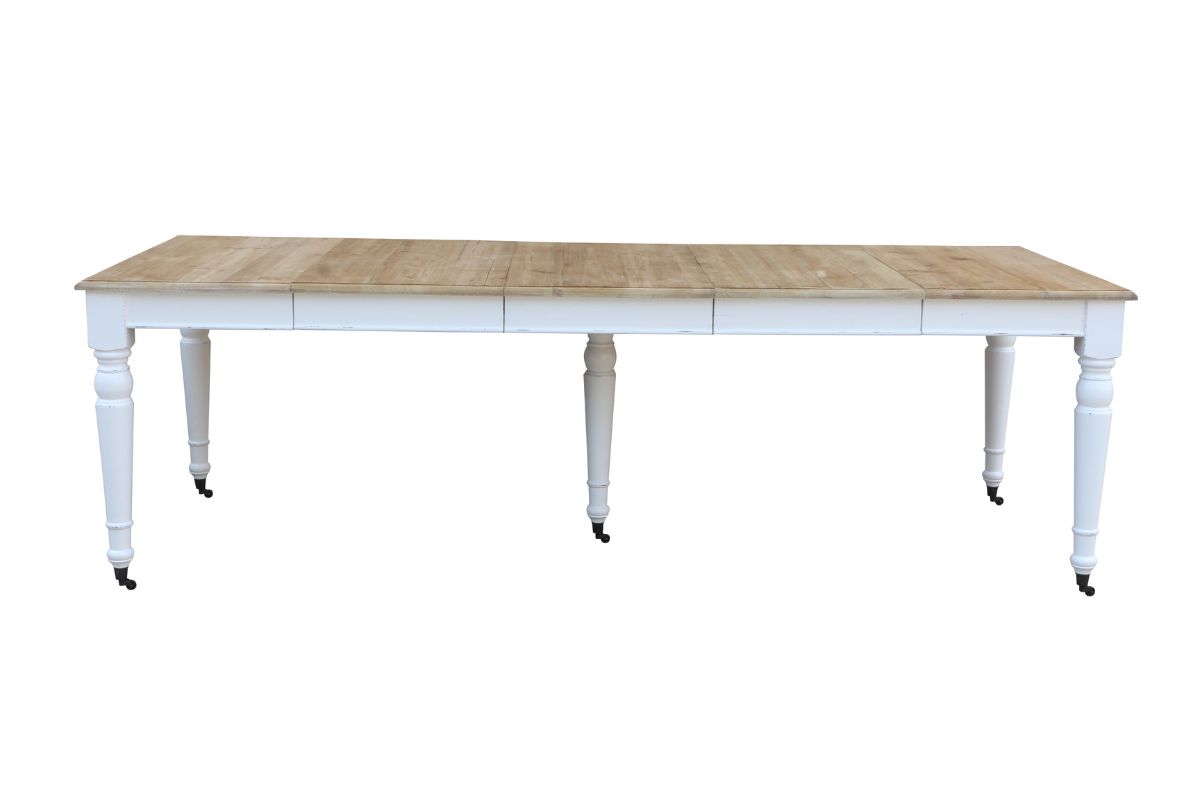 Tavolo da pranzo provenzale estensibile, grazie alle tavole supplementari. Il piano è realizzato in legno di pino naturale con i piedini dotati di rotelle.