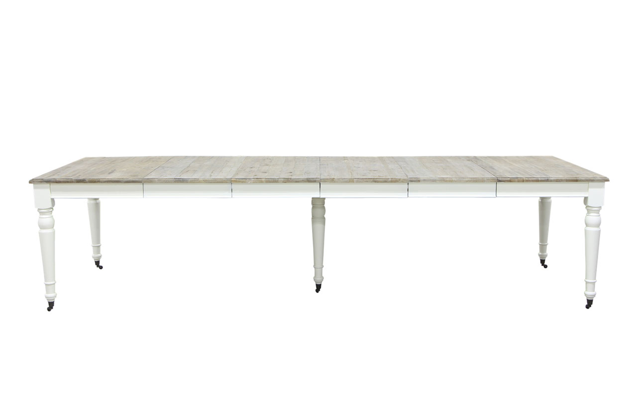 Tavolo da pranzo Provenzale quadrato, grazie alle tavole supplementari può raggiungere una dimensione massima, di 250 cm. Il piano è realizzato in legno di pino naturale a contrasto con la struttura bianca e piedini in metallo anticato con rotelle.