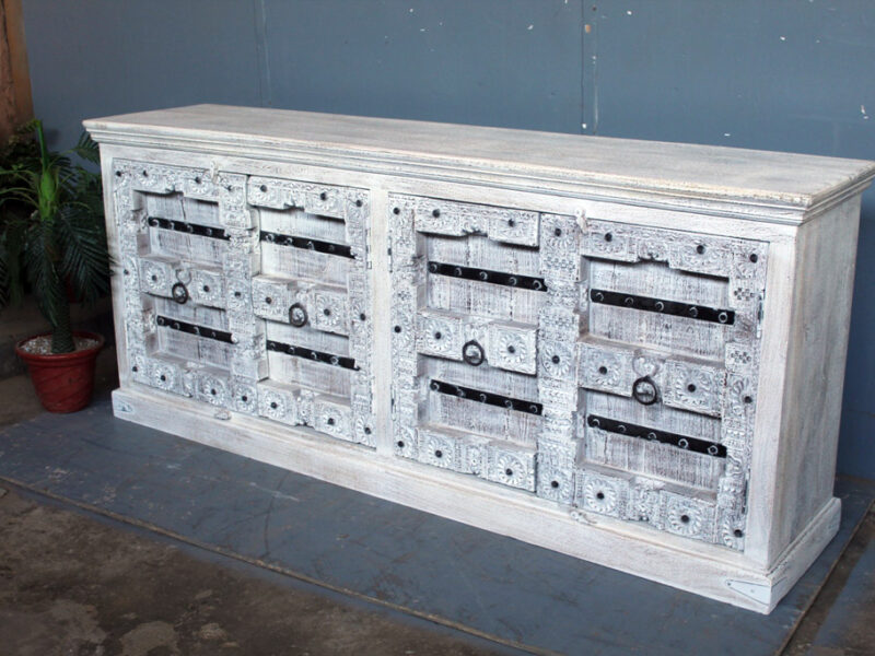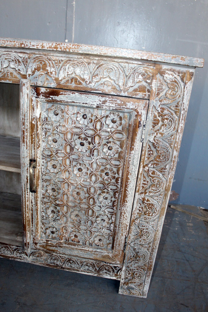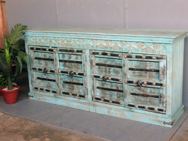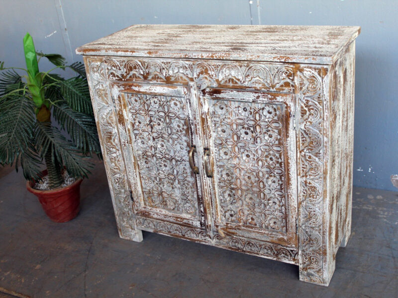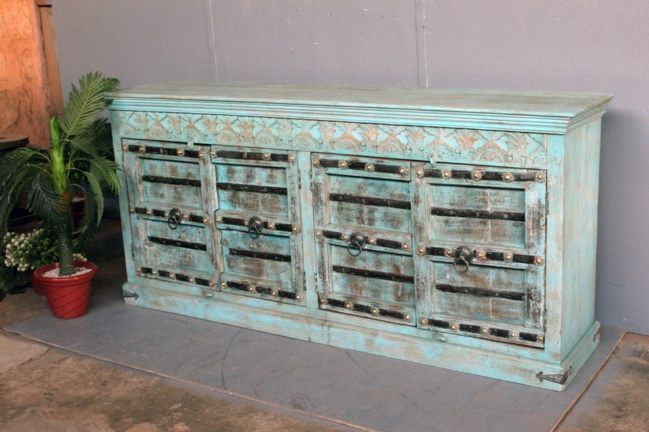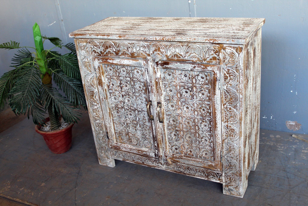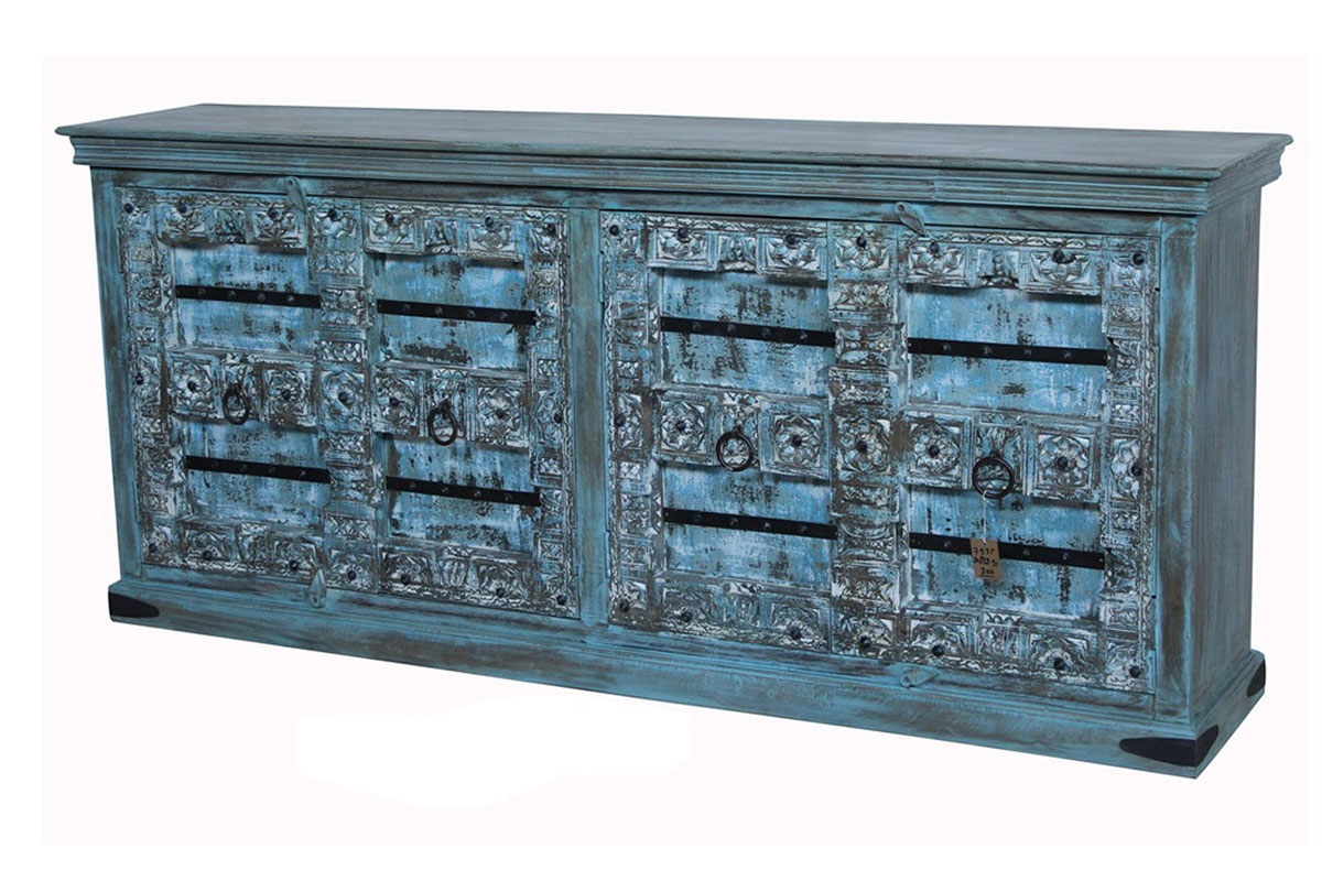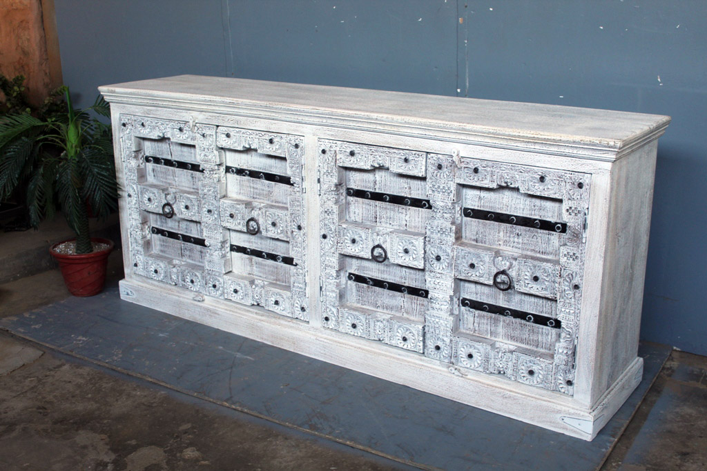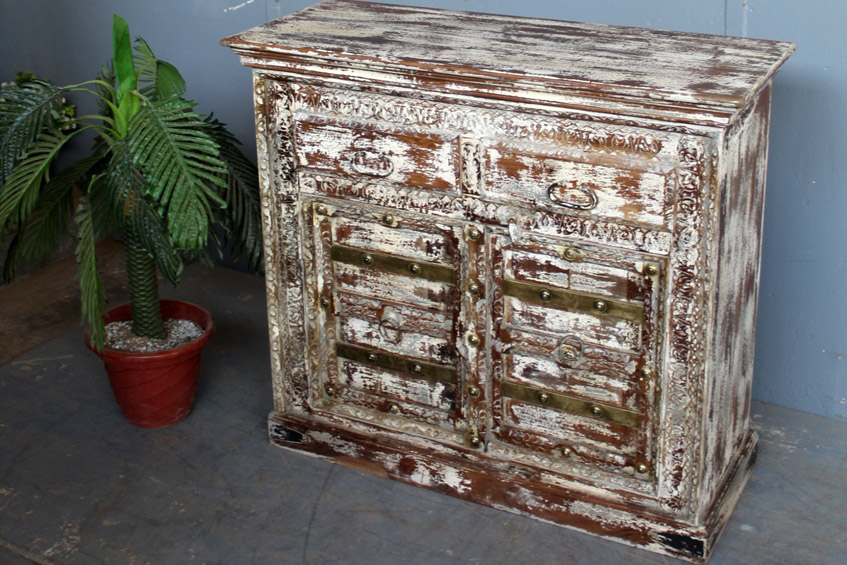Tra le caratteristiche peculiari dei mobili indiani vi è la lavorazione a mano delle cesellature e dei decori in altorilievo o bassorilievo e l’utilizzo di colori naturali che rispecchiano le tinte delle terre di provenienza.