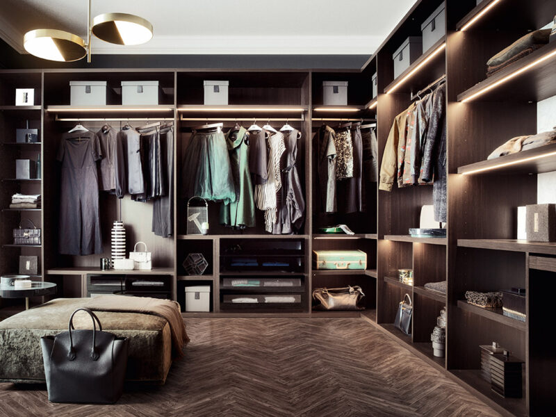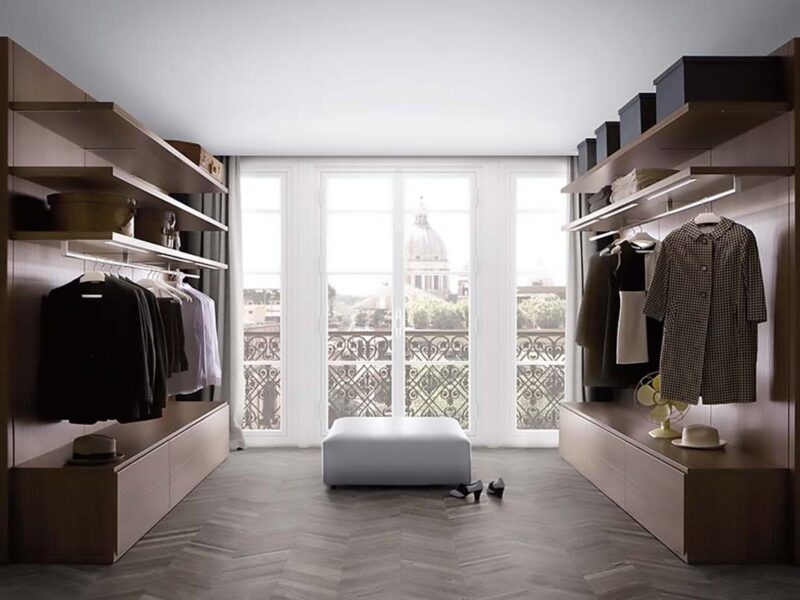 Se siete particolarmente ordinati, è molto bella la versione con ante trasparenti; anch’essa permette di alleggerire lo spazio e la volumetria del guardaroba, ma richiede particolare attenzione e costanza nell’organizzazione interna.